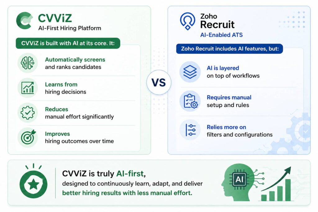 Compare CVViZ vs Zoho Recruit side by side to see how AI-powered screening, automation, and intelligent workflows impact hiring speed, candidate quality, and overall efficiency. Discover which platform delivers smarter, faster hiring outcomes.